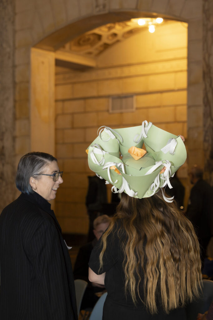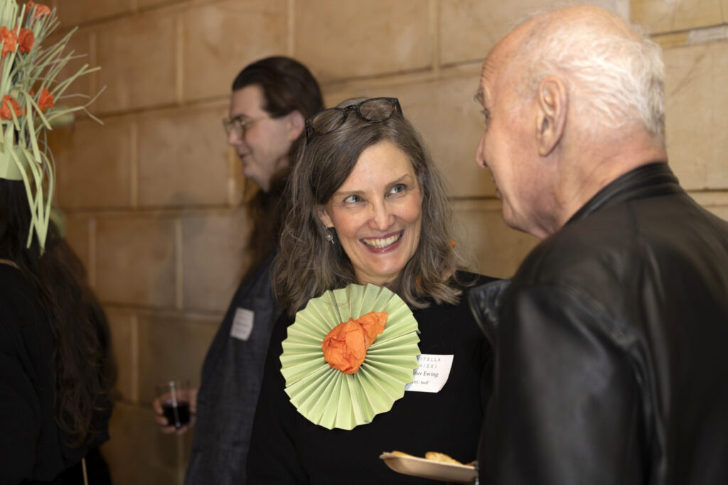 Emcee Pat Oleszko (CRF 2011, DG 2019) opened the evening’s program donning her hat and cape from Civitella’s 25th anniversary celebration at the Castle in 2019. She lead attendees and the staff, sporting repurposed handmade hats fitted for each member, through a recitation of every country from which Fellows hail. She referred to Civitella as the “ignited notions of creativity,” and said its MO is to be “inclusive of the arts all over the planet.”